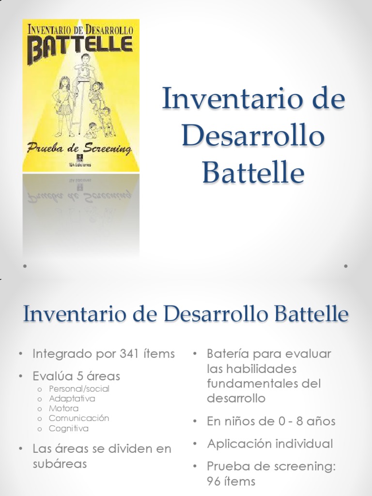 Inventario de desarrollo battelle descargar pdf. Buscar dentro del documento. Inventario de desarrollo battelle quien la usa teoria del desarrollo en que se basa los profesionales en las etapas de educacion infantil y primaria descripcion del battelle es una bateria para evaluar las habilidades fundamentales del desarrollo en ninos con edades. Test psicologicos tests de personalidad test. Batelle inventario de desarrollo objetivo.