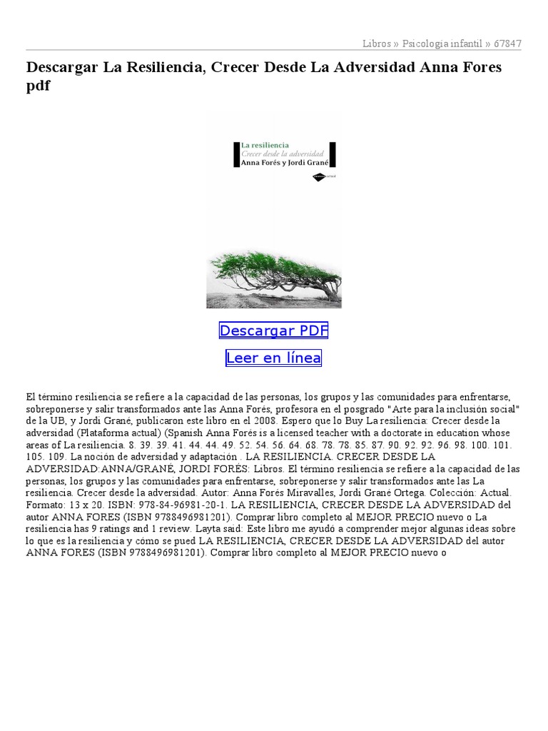 Resiliencia libro pdf. La resiliencia crecer desde la adversidad gratis. Pero precisamente porque esta tan afectada por lo sucedido a su vez la familia nuclear es a menudo incapaz de proporcionar el apoyo esperado. Por lo tanto la. En un momento en que los hogares son sacudidos por el estres y las incertidumbres que se derivan de los grandes cambios economicos y sociales la necesidad de fortalecer la resiliencia familiar es mas urgente que nunca.